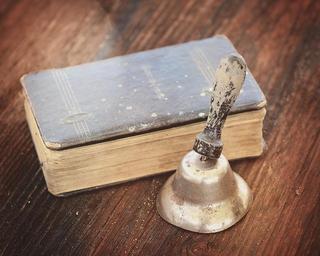 Keywords: book old old book prayer book antique bell wooden table wood close