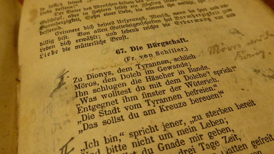 Keywords: book poem old book friedrich schiller notes textbook read antiquarian used books the guarantee
