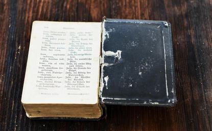 Keywords: book prayer book old antique used worn wood wooden table close faith