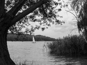 Keywords: boot lake water port sailing boat background bank reed tree holiday idyllic sail summer sky seascape recovery idyll rest relaxation on the water waters away silent