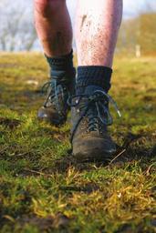 Keywords: boots mud walking walking boots outdoors hike hills wilderness grass soil stride walk travel camping dirty wet socks shins legs feet laces roam roaming climb countryside nature trail