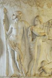 | Keywords: Borghese Vase Louvre Ma86 n5.jpg Dionysos wearing the mitra and holding a thyrsus with Ariadne playing the kithara; detail of the side A from the Borghese Vase Pentelic marble Attic work ca 40 “30 BC Found in 1569 in the Horti Sallustiani Rome Dionysos portant la mitra et tenant un thyrse accompagné d'Ariane jouant de la cithare ; détail de la face A du Vase Borghèse Marbre du Pentélique Å“uvre attique vers 40-30 av J -C Decouvert en 1569 dans les Jardins de Salluste à Rome H without the foot 1 2 m 3 ft 11 in Diam 1 35 m 4 ft 5 in Museum Louvre Department of Greek Etruscan and Roman Antiquities Denon ground floor Daru gallery object history credit line Borghese Collection 1649; purchase 1807 accession number Ma 86 MR 985 Jastrow 2007 other versions Reliefs of Dionysos Ariadne in sculpture Borghese Vase Thyrsus |