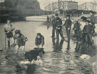 Keywords: Børn leger på vej hjem fra skole.jpg Børn leger i Ladegårdsåen på vej hjem fra skole i København omkring år 1900 Stor-København 1907 Alb Gnudtzmann Helmer Lind PD-old History of Copenhagen