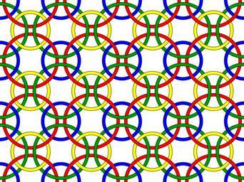 | Keywords: Borromean-chainmail-tile.svg Borromean chain-mail -- an indefinitely extended pattern in which each small circle is part of four Borromean rings configurations and each large circle is part of eight Borromean rings configurations so that every area contained within circles of three different colors is at the center of a Borromean rings configuration and no two circles are directly linked To free a yellow or blue loop two red loops or two green loops must be cut To free a red or green loop four other loops must be cut Borromean-chainmail-tile png 2010-01-18 03 12 UTC Borromean-chainmail-tile png AnonMoos derivative work McSush <span class signature-talk >talk</span> Other fields + RetouchedPicture redrawn as svg image McSush Borromean-chainmail-tile png Backdrop tiles Circular Borromean rings Knots in art and decoration Linked circle patterns Outline knots and links |