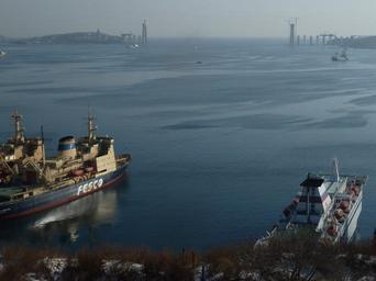 | Keywords: Bosfor Vostochnyi 2010 Dec.jpg en A view to the Eastern Bosphorus strait from Vladivostok Egersheld peninsula in December 2010; The bridge is under construction icebreaker Admiral Makarov and ferry Georg Ots right moored at quay in the foreground ru Вид на п олив Босфо Восточный из Владивостока мыс Эге шельд в декаб е 2010 ост ст оится ледокол Адми ал ака ов и па ом Гео г Отс сп ава п ишва товались у п ичала на пе еднем плане own Sergei Gutnikov 2011-12-16 Cc-zero Port of Vladivostok Admiral Makarov ship 1975 Georg Ots ship 1980 Russki Island bridge construction |