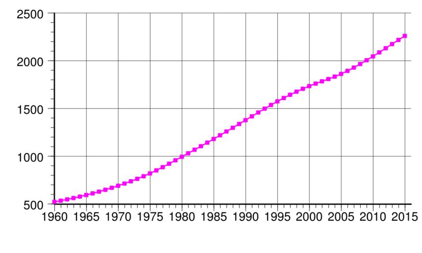| Keywords: Botswana-demography.svg en Botswana population 1960-2015 From UN estimates World Population Prospects http //esa un org/unpd/wpp/Excel-Data/population htm The 2015 Revision<br/>Y-axis Number of inhabitants in thousands 2009-10-08 own Patricia fidi Demmo other versions Generated with Wikimedia SVG Chart SVG Chart/box Gnuplot Version 4 2 patchlevel 5 <pre> set term svg size 800 500 dynamic font sans-serif set autoscale xfix set grid set style data linespoints set pointsize 0 6 unset key plot population txt linetype rgb FF00FF pt 5 </pre> Data file population txt <pre> 1950 413 1951 425 1952 437 1953 448 1954 459 1955 470 1956 480 1957 490 1958 501 1959 512 1960 524 1961 537 1962 550 1963 564 1964 580 1965 596 1966 613 1967 631 1968 651 1969 671 1970 693 1971 716 1972 740 1973 765 1974 793 1975 822 1976 854 1977 888 1978 923 1979 960 1980 996 1981 1033 1982 1070 1983 1107 1984 1145 1985 1183 1986 1222 1987 1261 1988 1300 1989 1340 1990 1380 1991 1420 1992 1460 1993 1500 1994 1539 1995 1576 1996 1612 1997 1646 1998 1678 1999 1708 2000 1737 2001 1763 2002 1787 2003 1810 2004 1836 2005 1864 2006 1896 2007 1930 2008 1968 2009 2007 2010 2048 2011 2090 2012 2133 2013 2177 2014 2220 2015 2262 </pre> Demographics of Botswana Temporal population graphs Botswana |