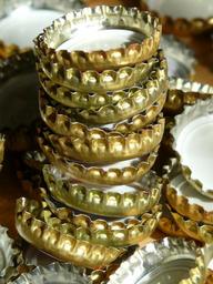 Keywords: bottle caps sheet sheet metal piece crown shaped gold golden sparkle closure bottle tower stack