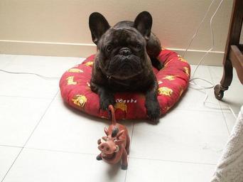 Keywords: Bouba III.JPG 2006-02-23 own assumed Jasef~commonswiki French Bulldog Prone dogs Dogs with objects Unidentified Phacochoerus Brindle dogs Dog beds The Lion King