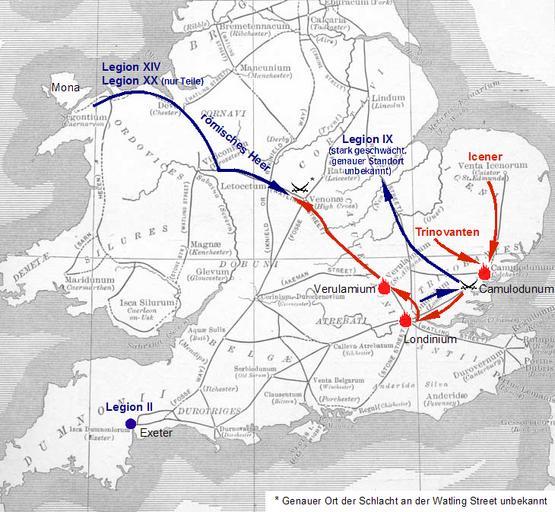| Keywords: Boudicca-Aufstand.PNG A somewhat inaccurate account of the Boudica Revolt <small>AD</small> 60 or 61 against the Romans in Britain set over an inaccurate map of Roman roads a century out of date Der Verlauf des de Boudicca-Aufstands gegen die Römer im Jahr 61 n Chr Basiert auf der PD-Karte Romanbritain jpg 11 07 2006 Triggerhappy Maps of Roman Britain Boudica Battle of Watling Street ImageNote 1 264 185 34 33 730 673 2 This leg may not have existed at the time The main route was through Wroxeter ImageNoteEnd 1 ImageNote 2 246 165 21 44 730 673 2 Omits known leg of this road between Wroxeter and Chester ImageNoteEnd 2 ImageNote 3 363 237 36 44 730 673 2 Conjectural ImageNoteEnd 3 ImageNote 4 498 282 39 38 730 673 2 Omits march of reserves to Londininum from Lindum ImageNoteEnd 4 ImageNote 5 524 415 31 30 730 673 2 Omits withdrawal south of Suetonius his men and the Londinian garrison ImageNoteEnd 5 |