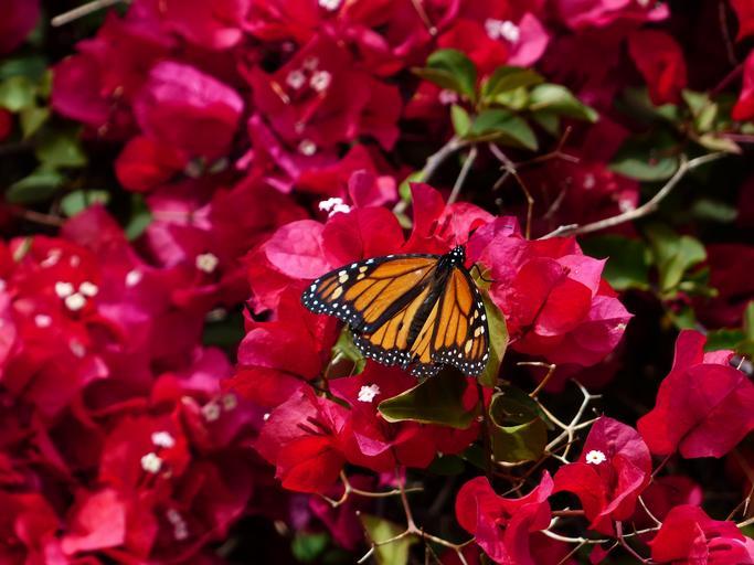 | Keywords: bougainvillea colorful butterfly monarch butterfly danaus plexippus american monarch orange black butterflies edelfalter nymphalidae walking butterfly flowers red intensive color bright bush bougainville triple flower four o'clock plant nyctaginaceae kahle hook flower bougainvillea glabra ornamental plant climber |