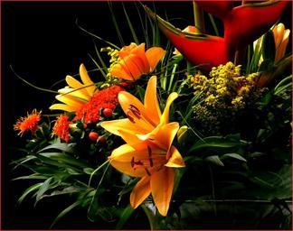 Keywords: bouquet of flowers flowers bouquet red ornamental plant flora flower vase birthday bouquet lilies roses rose flower plant blossom bloom yellow petals orange yellow flower bright deco decorative leaves leaf close closeup