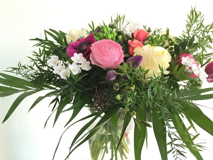 Keywords: bouquet spring jasmin roses ranunculus green leaves vase spring greetings bloom ranunculaceae flower vase schnittblume hahnenfußgewächs plant flowers decoration bouquet of flowers colorful nature