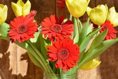 Keywords: bouquet tulips gerbera cut flowers spring flowers yellow flowers red flowers close flowers