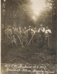 | Keywords: Bouřňák, Karel Lím, stavba silnice na Bouřňák.jpg cs Stavba silnice na Bouřňák Text v kronice odboru KČsT Horní Litvínov z let 1925-1930 Dne 12 6 1927 zúčastnilo se 6 členů našeho klubu přípravných prací pro stavbu chaty na Bouřňáku 869 m za vedení župního předsedy učitele Líma z Duchcova Návrat pěšky hřebenovou cestou na Fláje Teplické vodárně přes Hellengrund a Raušengrund celkem 26 km Karel Lím druhý zprava s lopatou 1927-06-12 http //www turistalitvinov estranky cz/clanky/o-nas html mr Vrábl - unknown dates http //www outofcopyright eu/calculator html calculator test ok Custom license marker 2013 12 12 Anonymous-EU Uploaded with UploadWizard Karel Lím Bouřňák PD files originally uploaded by Palu |