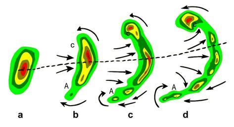 | Keywords: Bow echo diagram.svg Typical evolution of a thunderstorm radar echo a into a bow echo b c and into a comma echo d Dashed line indicates axis of greatest potential for downbursts Arrows indicate wind flow relative to the storm Note regions of cyclonic rotation C and anticyclonic rotation A ; both regions especially C are capable of supporting tornado development in some cases Vectorization of http //www srh noaa gov/oun/severewx/figure1 php Plain GIF version was uploaded to English Wikipedia as Bowecho1 gif on 9 Apr 2007 UTC by Utahweather National Weather Service Public domain inkscape PD-USGov Remember the dot Squall line diagrams |