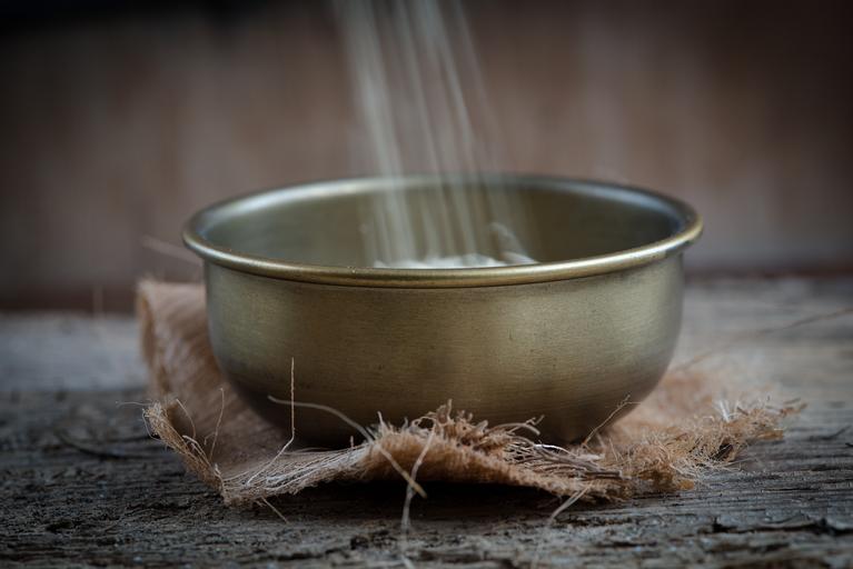 Keywords: bowl brass brass bowl old used shell rice wholemeal rice filling in motion close food-photography food
