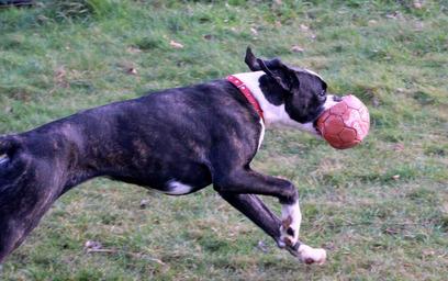 Keywords: boxer dog pet run let off steam power black and white young dog play ball