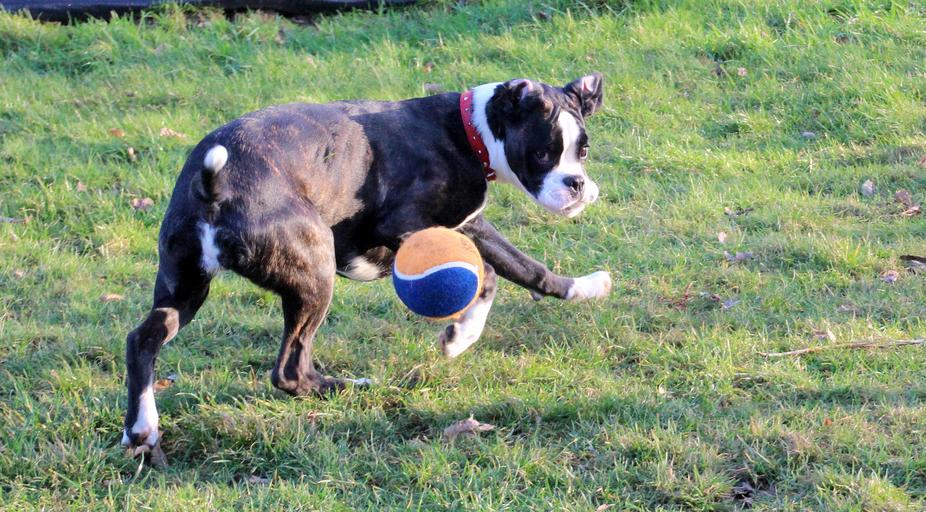 Keywords: boxer dog pet run let off steam power black and white young dog play ball movement speed