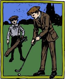 Keywords: boy caddy color colour father golf male man son sports suit