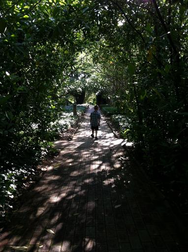 Keywords: boy child garden walkway bricks brick walkway green lush summer