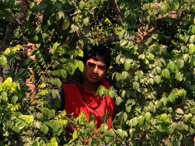 Keywords: boy on tree picking fruits tree starfruit climbing dharwad india