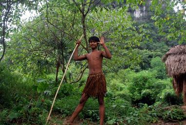 Keywords: boy person ethnic chinese stick wielding barks wear clad waving hut greenery