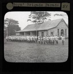 | Keywords: Boy's Brigade Parade, Kenya, ca.1905-ca.1940 (imp-cswc-GB-237-CSWC47-LS7-051).jpg en <br> Boy's Brigade Parade Kenya ca 1905-ca 1940 Photograph of a Boy's Brigade Parade A group of boys in full uniform are lined up outside a brick built building A boy to the far right of the group is carrying a drum ; This belongs to a series of Church of Scotland Foreign Missions Committee lantern slides relating to the Kikuyu Mission in Kenya which was set up by Church of Scotland missionaries Hospitals were established by Scottish missionaries in Kikuyu in 1908 in Tumutumu in 1909 and in Chogoria in 1922 The missionaries also introduced the Presbyterian Church to the area The Kikuyu are Kenya's most populous ethnic group Photographer Unknown Filename imp-cswc-GB-237-CSWC47-LS7-051 tif Coverage date 1905/1940 Part of collection International Mission Photography Archive ca 1860-ca 1960 Type images Part of subcollection Photographs from the Centre for the Study of World Christianity University of Edinburgh U K ca 1900-ca 1940s Repository name Centre for the Study of World Christianity Archival file impaunpub_Volume7/1657 url Repository address The University of Edinburgh School of Divinity New College Mound Place Edinburgh EH1 2LX United Kingdom Geographic subject country Kenya Format aacr2 1 lantern slide 8 x 8 cm Geographic subject continent Africa Rights Contact the repository for details Part of series Kenya Mission LS7 Repository email divinity-CSWC ed ac uk Subject lcsh Keyword Youth movements; Parades; Rites and ceremonies Date created 1905/1940 Publisher of the digital version University of Southern California Libraries Subject aat genre group portraits Format aat lantern slides Legacy record ID impa-m68764 Access conditions http //www ed ac uk/schools-departments/divinity/research/centres/world-christianity/collections-resources File GB 237 CSWC47/LS7/51 1905/1940 author http //digitallibrary usc edu/cdm/ref/collection/p15799coll123/id/64777 PD-old-70-1923 Magic lantern images Images from USC Digital Library uploaded by Fæ International Mission Photography Archive ca 1860-ca 1960 |