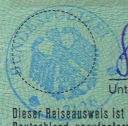 | Keywords: BPOL-Dienstsiegel.JPG Kleines Dienstsiegel der deutschen Bundespolizei in einem Reiseausweis als Paßersatz own 2006-04-13 User Mattes PD-GermanGov PD-Seal-Germany Bundesadler Federal Police of Germany Taken with Panasonic Lumix DMC-LC50 Work by Mattes 2006 User Mattes/Contributions/Topics/ Law enforcement and justice User Mattes/Contributions/Topics/banners coat of arms flags logos seals and signs Rubber stamp imprints | ||||