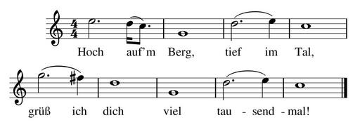Keywords: Brahms Symphony No 1 Hoch aufm Berg.svg en Sheet music example of Brahms' symphony No 1 with his own lyrics Lyrics assignment is based on the letter http //imslp org/wiki/Albumblatt_f C3 BCr_Clara_Schumann_ Brahms _Johannes The rhythm and slurs are modified according to the original symphony 2016-07-20 own Hb1211 other versions LilyPond source <source lang latex > \header tagline \score \relative c \override Score BarNumber break-visibility ' f f f \key c \major \numericTimeSignature e2 d16 c8 g1 d'2 \ e4\ c1 \break g'2 \ fis4\ d1 g d'2 \ e4\ c1 \bar \addlyrics Hoch auf ™m Berg tief im Tal grüß ich dich viel tau -- send -- mal \paper paper-width 14\cm ragged-right f indent 1 3\cm paper-height 5 5\cm Lyrics assignment is based on the letter http //imslp org/wiki/Albumblatt_f C3 BCr_Clara_Schumann_ Brahms _Johannes The rhythm and slurs are modified accoriding to the original symphony </source> cc0 Sheet music examples Johannes Brahms