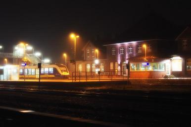 Keywords: bramsche germany train station depot railroad railway transportation track buildings night evening lights reflections outside