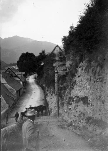 -- Vallée -- Route -- Village -- Maison -- Chemin -- Homme -- Costume masculin -- Voiture à attelage -- Cheval -- Arbre -- Végétation -- Fête de la Saint-Jean [?]