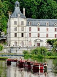 Keywords: brantome dronhe river marouatte chateau weir reflection tranquil france calm water boats