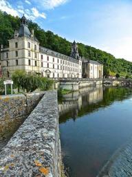Keywords: brantome dronhe river marouatte chateau weir reflection tranquil france calm water wall perspective