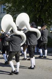Keywords: brass band marching costume bavarian music band chapel street festival pageant instrument music musicians men human upper swabia tradition musician blowers germany move tuba