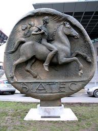| Keywords: Bratislava narodna banka Biatec Cvengrosova.jpg sk Bronzová plastika Biatec pred Národnou bankou Slovenskej republiky v Bratislave Trojmetrový bronzový kruhový reliéf Biateca keltského vládcu z 1 storočia pred Kristom bol inšpirovaný mincou Od ruku 1990 bol v depozitári mestskej galérie v Bratislave Plastika bola odhalená v novembri 2008 own Ľudmila Cvengrošová sculptor - cc-by-3 0 <br> Peter Zelizňák photo 2008-12-15 Zákon č 618/2003 Z z o autorskom práve Slovenskej republiky § 27 Použitie diela umiestneného na verejnom priestranstve cc-by-sa-3 0 GFDL FoP-Slovakia Sculpture of Biatec Images by Peter Zeliznak December 2008 in Slovakia |