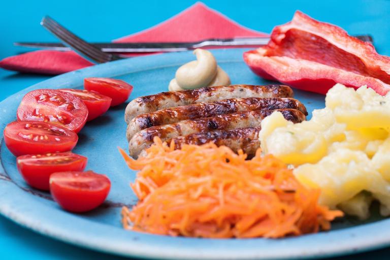 Keywords: bratwurst sausage grill sausages grill sausage meat barbecue grill heat stainless pork sausage gentlemen's evening garden party potato salad carrot salad tomatoes paprika red orange yellow