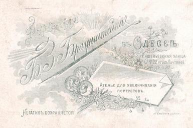 | Keywords: Braunstein Odessa.jpg  ru Паспа ту Фотог афия Б З Б аунштейна в Одессе Ришельевская ул 22 s 1900 - 1910s \ before 1917 Семейный а хив Г иго ия Ганзбу га  Фишелес <gallery>File Nina Zähner jpg</gallery> PD-RusEmpire Uploaded with UploadWizard Photographers from Odessa Rishelievska Street |