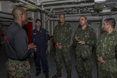| Keywords: Brazilian naval officers and marines aboard USS America 140802-N-MD297-028.jpg en Brazilian marine Lt Hebert de Melo Almeida center discusses Brazilian marine martial arts training with Sgt Tyson Hicks left aboard the future amphibious assault ship USS America LHA 6 The Brazilian naval officers and marines will spend the next few days aboard America working alongside U S naval officers America is currently traveling through the U S Southern Command and U S 4th Fleet area of responsibility on her maiden transit America visits the Americas America is the first ship of its class replacing the Tarawa-class of amphibious assault ships As the next generation big-deck amphibious assault ship America is optimized for aviation capable of supporting current and future aircraft such as the MV-22 Osprey and F-35B Joint Strike Fighter The ship is scheduled to be ceremoniously commissioned Oct 11 in San Francisco U S Navy photo by Mass Communication Specialist 3rd Class Huey D Younger Jr /Released 2014-08-02 Petty Officer 3rd Class Huey Younger https //www dvidshub net/image/1480465 140802-N-MD297-028 2014-08-03 22 57 USS AMERICA AT SEA PD-USGov-Military-Navy MV-22B Osprey USS America LHA-6 Images from DoD uploaded by Fæ |