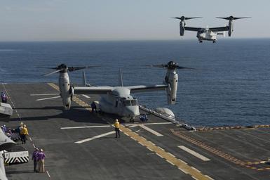 | Keywords: Brazilian VIPs tour USS America 140804-N-MD297-020.jpg en A tiltrotor MV-22 Osprey assigned to the Argonauts of Marine Operational Test and Evaluation Squadron VMX 22 transporting distinguished visitors from Brazil prepares to land on the flight deck of future amphibious assault ship USS America LHA 6 America is currently traveling through the U S Southern Command and U S 4th Fleet area of responsibility on her maiden transit America visits the Americas America is the first ship of its class replacing the Tarawa-class of amphibious assault ships As the next generation big-deck amphibious assault ship America is optimized for aviation capable of supporting current and future aircraft such as the Osprey and F-35B Joint Strike Fighter The ship is scheduled to be ceremoniously commissioned Oct 11 in San Francisco U S Navy photo by Mass Communication Specialist 3rd Class Huey D Younger Jr /Released 2014-08-04 Petty Officer 3rd Class Huey Younger https //www dvidshub net/image/1488037 140804-N-MD297-020 2014-08-06 22 51 CO PD-USGov-Military-Navy MV-22B Osprey Aboard USS America LHA-6 Images from DoD uploaded by Fæ |