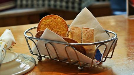 Keywords: bread basket butter french food indoor dessert Bread and crackers. Bread and crackers.