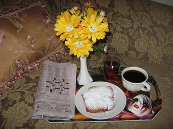Keywords: breakfast breakfast tray coffee beignets chaise chaise lounge morning breakfast