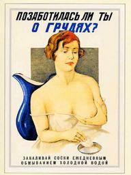 | Keywords: Breast care USSR poster.jpg A 1930 Soviet poster propagating breast care The inscription reads Have you taken care of your breasts Wash your nipples with cold water every day Compare another version from the same poster Image Grudi jpg PD-Russia-2008 Female human breasts in art Posters of the Soviet Union 1930 Women in posters of the Soviet Union Women touching their breasts in art | ||||