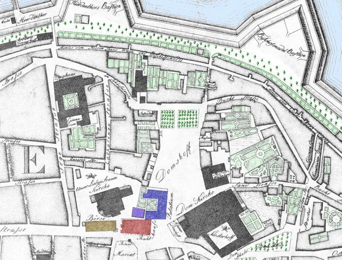 | Keywords: Bremen 1796 Murtfeld Domshof Wall.jpg adapted cut of the citymap of Bremen printed in 1796 red Rathaus townhall blue Palatium episcopal palace that time residence of an administrator of the Hanoveran enclave inside the city ochre Börse stock exchange Almost all gardens in the old city on the right bank were situated in the episcopal/Hanoveran part collotype of the original map available in Staatsarchiv Bremen 1796 adaption 2015-01-07 de Carl Ludwig Murtfeldt File Bremen 1796 Rathaus Palatium Gärten png larger cut File Bremen 1796 Murtfeldt Rathaus Palatium png larger cut less adapted File Bremen 1796 Murtfeldt jpg entire map 18th-century maps of Germany Parts of old maps of Bremen History of Town hall of Bremen Mitte Bremen Bremen in the 1790s Plans maps of Bremen Cathedral PD-old-100 |
