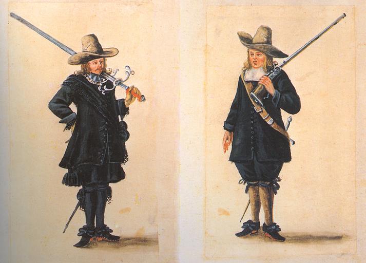 Keywords: Bremer Soldaten - Koster-Chronik - 17. Jahrhundert.jpg en 17th century soldiers from the Schützenkompanie of Bremen Germany Left-hand a Freischütze with a two-handed sword right-hand a angehender Schütze with a musket Watercolor paintings from the Koster-Chronik de Bremer Schützen des 17 Jahrhunderts Links ein Freischütze mit Schlachtschwert rechts ein angehender Schütze mit Muskete Aquarell aus der Koster-Chronik Herbert Schwarzwälder Bremen im 17 Jahrhundert Glanz und Elend einer Hansestadt Edition Temmen Bremen 1996 Author century 17 Bremen in the 17th century German soldiers in art Watercolor paintings of men Military of Bremen PD-Art |