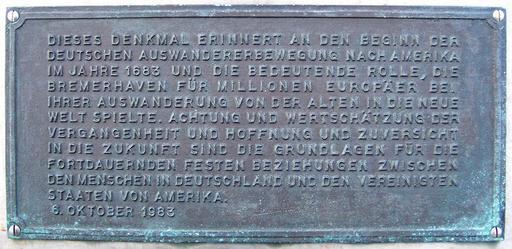 | Keywords: BremerhavenAuswandererDenkmal-2.jpg Bremerhaven Auswanderer-Denkmal an der Schleuse zum Neuen Hafen own 2007-10 Jürgen Howaldt File BremerhavenAuswandererDenkmal-1 jpg 53 32 42 2 N 8 34 6 1 E type landmark_dim 20_region DE-HB Plaques in Bremerhaven 1983 in Bremerhaven Emigrants from Germany |
