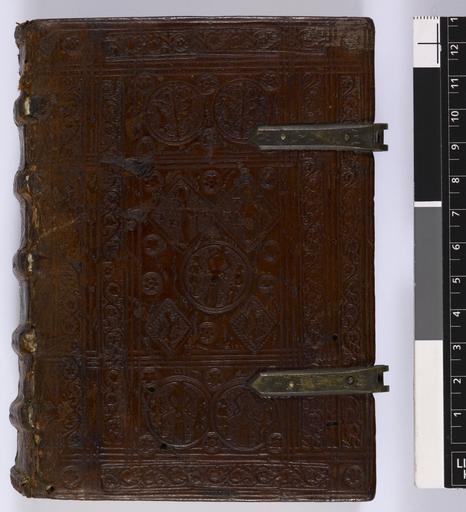 Keywords: BREVIARY, of Cologne use, as appears from the Calendar, from the offices in honour of St. Peter, the Three Kin", and St. Heribert (see below, artt. 1, 4, 6, 7), and from the rubric "Sciendim - Upper cover (Add Ms 38003).jpg Style Unspecified; Caption Upper cover; Colour Brown; Edge Unspecified exhibition history Decorative Technique Tooled in blind; Cover Material Unspecified 5½in x 3 7/8 in A D 1436 Bound in brown leather stamped with roundels of the martyrdom of St Agatha and of two goats affonted browsing on a tree and lozenges of the fall of Adam of St Antony and of a lion rampant arranged in panels with rosettes in the intervening spaces and with a roll-stamp border of scroll and-flower pattern; remains of two long clasps catching on to the upper cover Phillipps MS 559 sale-cat 1910 lot 126 from the library of Leander van Ess S T D of Marburg and Darmstadt May be Netherlands binding Five raised spine bands object history Text 15c; Unspecified; Unspecified object type Cc-zero place of creation Binding Netherlands place of discovery Unspecified British Library image http //www bl uk/catalogues/bookbindings/LargeImage aspx RecordId 020-000016336 ImageId ImageId 55708 Copyright BL BREVIARY of Cologne use as appears from the Calendar from the offices in honour of St Peter the Three Kin and St Heribert see below artt 1 4 6 7 and from the rubric Sciendim quod sic seruatur de vna virgine in maiori ecclesia Colonensi etc Manuscript on paper and parchment Uploaded with GWToolset BREVIARY of Cologne use as appears from the Calendar from the offices in honour of St Peter the Three Kin and St Heribert see below artt 1 4 6 7 and from the rubric Sciendim - Upper cover Add Ms 38003 http //www webarchive org uk/bldatasets/bindings/Add38003 jpg Bookbinding 15th-century bookbinding British Library Bookbindings Taken with Phase One P45+ |