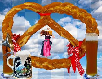 Keywords: breze pretzel beer wheat beer bavaria munich oktoberfest tradition dirndl beer mug foam waitress mug beer glass image overlay ozapft is loop clouds blue white sky wheat hello