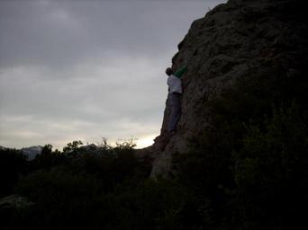 Keywords: Brian Climbing2.JPG en Boy climbing mountain at dusk own LeilaN summer 2003 Eagles Cliff Colorado Dusk Bouldering