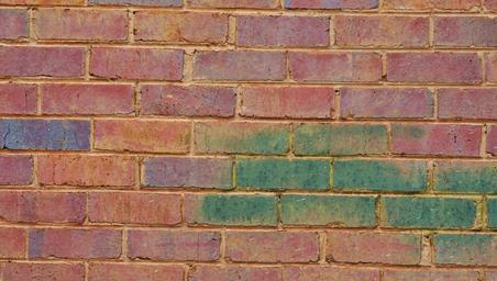 Keywords: brick wall red tinted green patterns designs baked clay tiles blocks rectangles rectangular shapes textures hard solid rough flat surfaces constructions exterior buildings