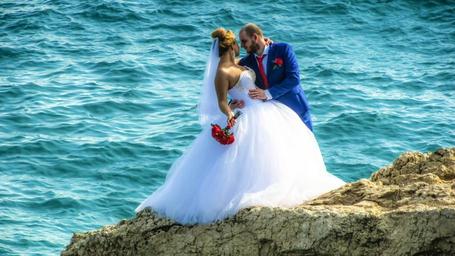 Keywords: bride groom couple romance love wedding dress white wedding outdoor nature sea cyprus together marriage romantic